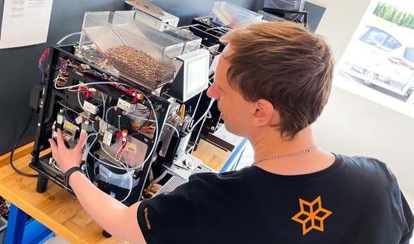 Han er servicemedarbejder hos Bentax, i modulværkstedet som det hedder. Her får han brugte kaffemaskiner i hånden, som skal efterprøves for fejl. Holder de vand – og kaffe i sig?