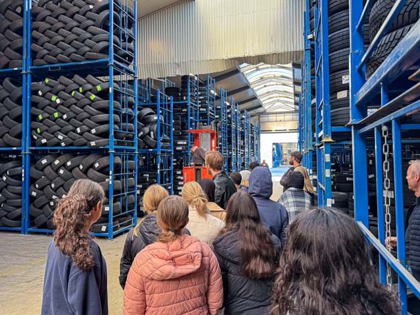 Her er tusindvis af dæk stablet på hylder, og trucks suser frem og tilbage. En medarbejder hæver trucken op i 5 meters højde, og drenge som piger spørger begejstret om de må prøve at køre i truck.