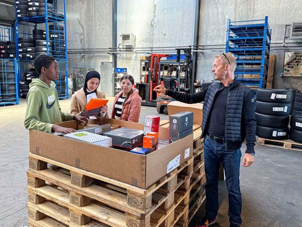 Med skoleklasse på rundvisning på lageret hos Viggo Laursen